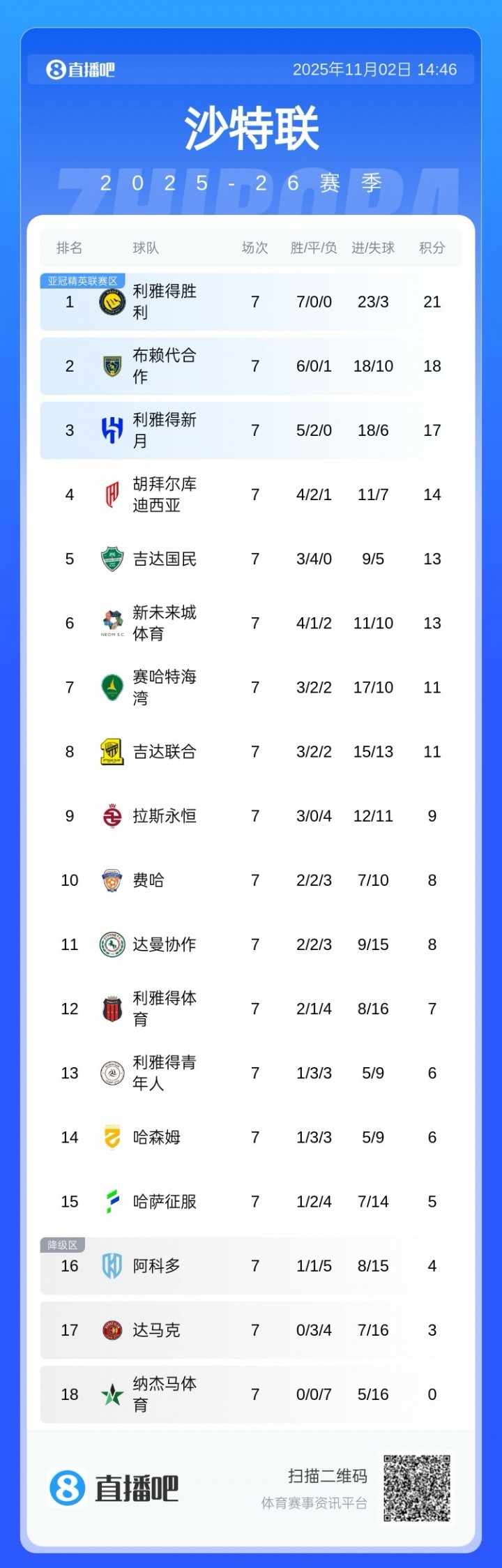 直播吧11月02日讯沙特联第7轮,利雅得胜利主场2-1逆转费哈,C罗双响+第104分钟点射绝杀。