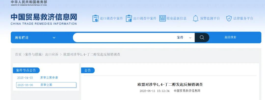 近日,欧盟委员会发布公告称,应INEOS Solvents SA于2025年4月3日提出的申请,对原产于中国、沙特阿拉伯和美国的1,4-丁二醇(1,4-Butanediol)发起反倾销调查。