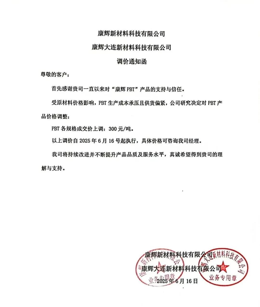 近日,康辉新材料率先打响"涨价第一枪",16日表示受原材料价格影响,PBT生产成本承压且供货偏紧,对PBT各规格成交价上调300元/吨。